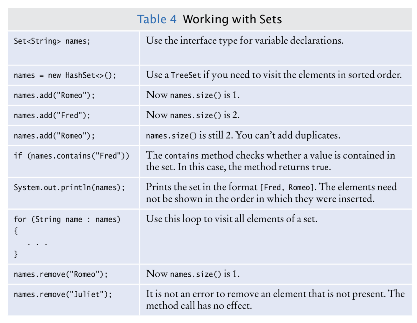 Les sets sont des collections qui ne permettent pas d’avoir deux fois la même valeur. L’insertion d’une valeur identique ne change pas la collection.